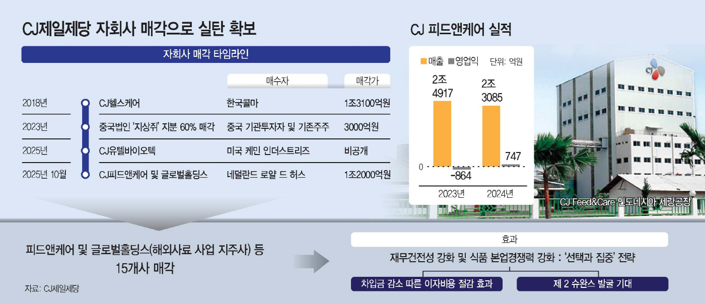 이번 매각은 세 번째 시도 끝에 성사됐다. 제일제당은 2019년 네덜란드 사료기업 뉴트레코와 협상했지만 가격 이견으로 결렬됐고, 2020년에는 인수 희망자 부족으로 매각을 중단한 바 있다. 피드앤케어는 곡물 가격과 국제 정세에 따라 실적 변동성이 크고 성장성이 제한적이어서 CJ제일제당의 잠재 매물 중 하나로 오랫동안 거론돼 왔다. 제일제당의 비주력 자회사 매각은 이번이 처음이 아니다. 2018년 2월 제약사업 자회사 CJ헬스케어를 한국콜마에 1조3100억원에 매각했고 지난해 중국 자회사 지샹쥐 지분 60%를 약 3000억원에, 최근에는 중국 효소·발효 자회사 CJ유텔바이오텍을 미국 케민인더스트리즈에 각각 처분했다. 지난 4월에는 브라질 자회사 CJ셀렉타 매각을 추진 중에 철회하기도 했다.