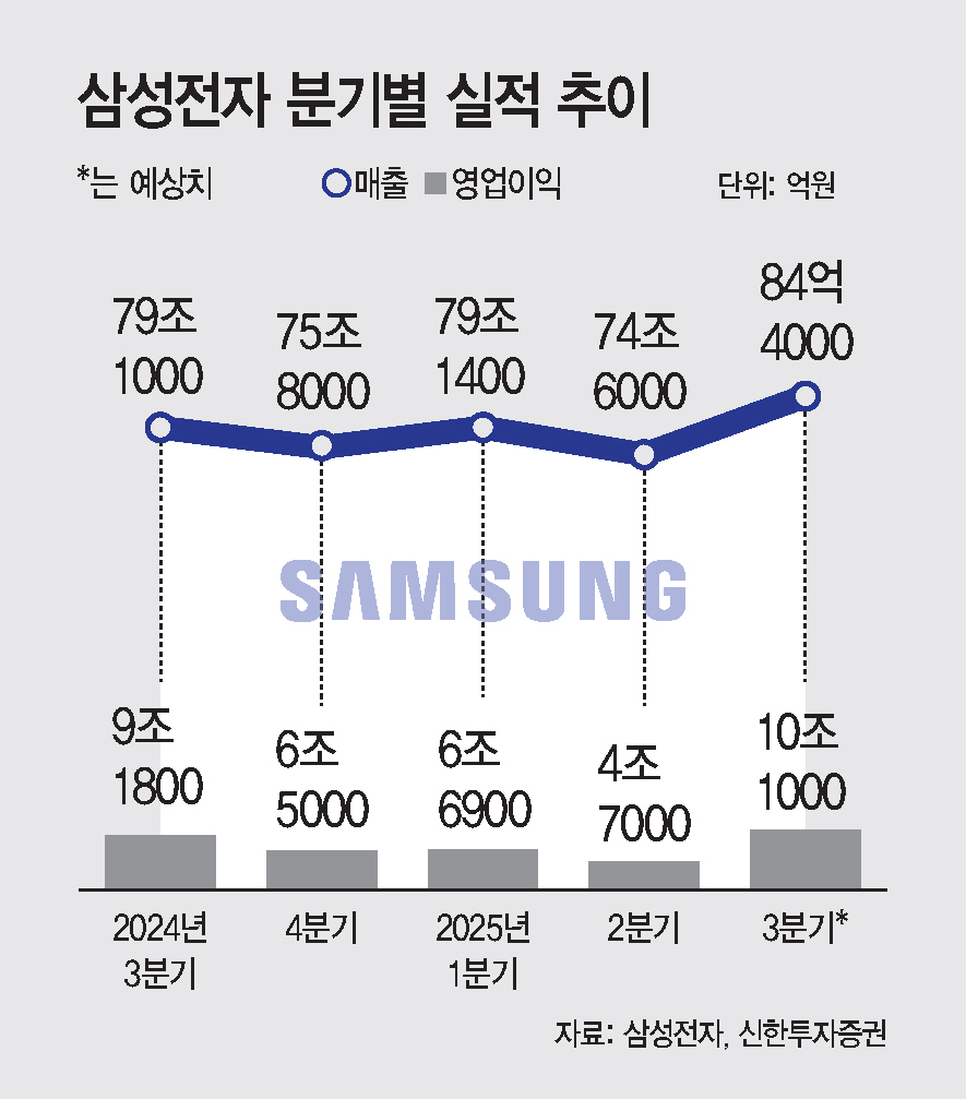 1일 업계에 따르면 삼성전자는 추석 연휴가 지나고 난 뒤 3분기 잠정실적을 발표한다. 금융정보업체 에프앤가이드에 따르면 삼성전자 3분기 컨센서스(증권가 전망치)는 매출 83조원대, 영업이익 9조원대다. 특히 주요 증권사들이 10조원 안팎을 제시하며 컨센서스를 웃도는 호실적이 유력하다는 평가가 나온다.