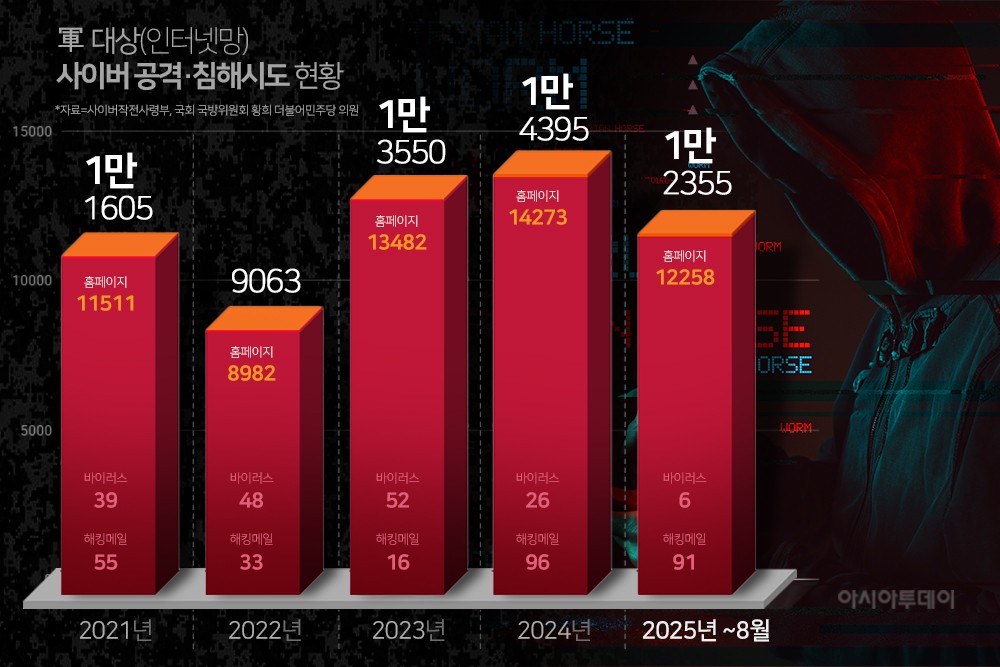 군의 기밀 및 정보를 노린 사이버공격 시도는 2022년 9063건이었던 것이 2024년 1만4395건으로 2년 새 60% 가량 급증했다. 올해도 8월까지 1만2355건이 발생해 이 추세대로라면 연말까지 지난해 사이버공격 시도 건수를 훨씬 상회할 전망이다. 해킹메일을 통한 사이버 침해시도는 2023년 16건에서 2024년 96건으로 6배 이상 급증했다.