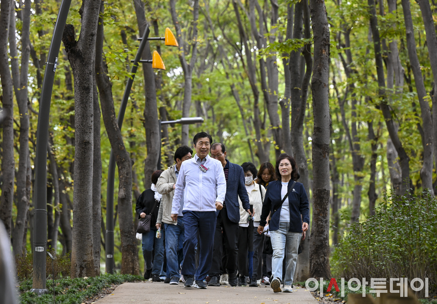 전성수 서초구청장이 14일 서울 서초구 길마중 초록숲길에서 열린 '길마중 초록숲길 건겅걷기' 행사에 참석해 주민들과 대화하며 걷고 있다. 서초구는 도심 속 힐링 녹지공간 '길마중 초록숲길' 2단계 재정비를 지난 7월 완료하고 황토 체험길, 휴게·운동 공간 등 다양한 테마와 즐길거리 가득한 산책 환경을 조성했다. 내년 3단계 구간이 완성되면 서초IC부터 한강까지 이어지는 약4.5km의 서초를 대표하는 명품 숲길로 재탄생될 전망이다. /정재훈 기자
