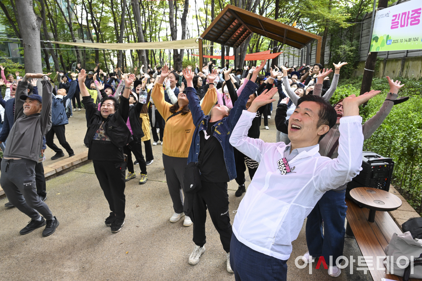 전성수 서초구청장이 14일 서울 서초구 길마중 초록숲길에서 열린 '길마중 초록숲길 건겅걷기' 행사에 참석해 주민들과 준비운동을 하고 있다. 서초구는 도심 속 힐링 녹지공간 '길마중 초록숲길' 2단계 재정비를 지난 7월 완료하고 황토 체험길, 휴게·운동 공간 등 다양한 테마와 즐길거리 가득한 산책 환경을 조성했다. 내년 3단계 구간이 완성되면 서초IC부터 한강까지 이어지는 약4.5km의 서초를 대표하는 명품 숲길로 재탄생될 전망이다. /정재훈 기자