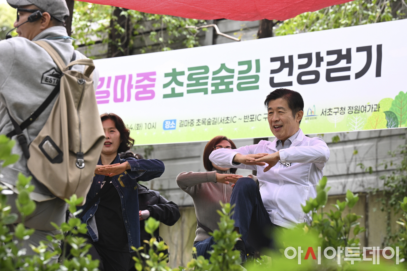 전성수 서초구청장이 14일 서울 서초구 길마중 초록숲길에서 열린 '길마중 초록숲길 건겅걷기' 행사에 참석해 주민들과 준비운동을 하고 있다. 서초구는 도심 속 힐링 녹지공간 '길마중 초록숲길' 2단계 재정비를 지난 7월 완료하고 황토 체험길, 휴게·운동 공간 등 다양한 테마와 즐길거리 가득한 산책 환경을 조성했다. 내년 3단계 구간이 완성되면 서초IC부터 한강까지 이어지는 약4.5km의 서초를 대표하는 명품 숲길로 재탄생될 전망이다. /정재훈 기자