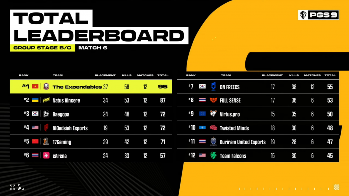 14일 진행된 B·C조 대결에서 필리핀의 '디 익스펜더블스(The Expendables, TE)'가 총점 95점을 확보하며 종합 1위로 올라섰다. 1일 차 상위권에 머물던 TE는 2일 차 첫 경기부터 안정적인 교전과 치킨 운영으로 초반 기세를 확실히 굳혔다.