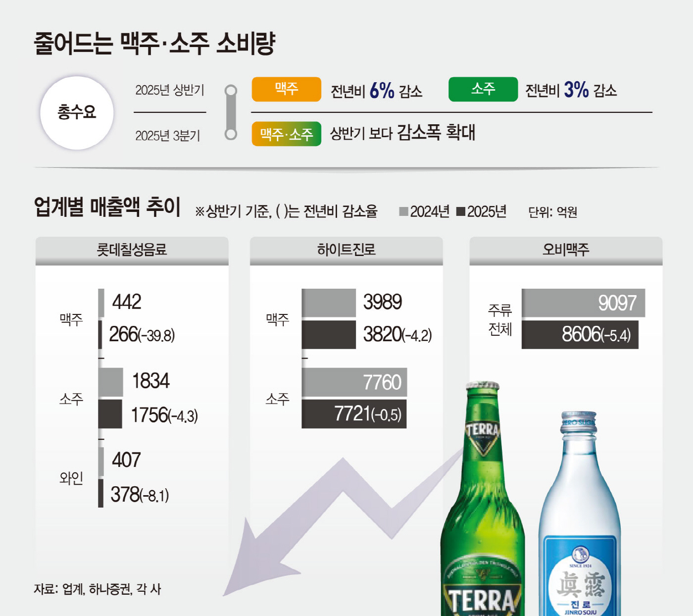 하이트진로도 상반기 맥주 매출이 3820억원으로 전년(3989억원) 대비 4.2% 감소했고, 소주는 7721억원으로 전년(7760억원) 대비 0.5% 줄었다. 업계 1위 오비맥주의 주류 전체 매출도 8606억원으로 전년(9097억원) 대비 5.4% 감소했다.