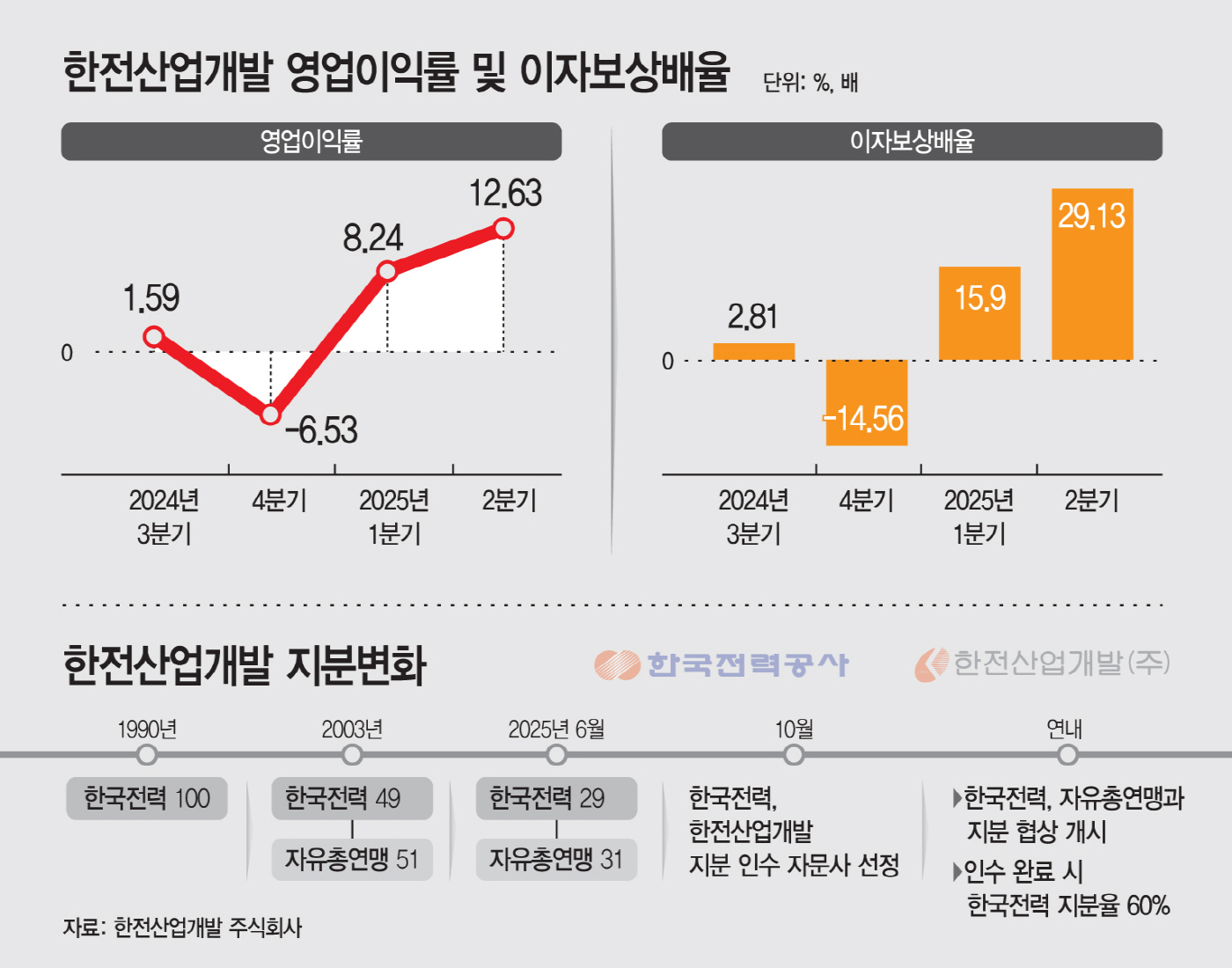 1990년 4월 설립된 한전산업개발은 전국의 화력·원자력발전소 등에서 발전설비 운전과 정비(O&M) 사업을 주력으로 하고 있다. 한국서부발전과 한국수력원자력을 비롯해 주요 발전5사와 민간 발전사업자를 상대로 수익을 올리고 있는 구조다. 지난해 연결기준 매출은 3675억원, 영업이익은 161억원을 기록했다. 올해 상반기 누적 매출과 누적 영업이익은 각각 1996억원과 212억원이다. 한전산업개발의 2분기 기준 이자보상배율도 29.13배로 재무적으로도 안정적인 상황이다. 이자보상배율은 영업이익을 이자 비용으로 나눈 값으로, 1 미만이면 벌어들인 돈보다 이자 비용이 많아 채무 부담이 크다는 의미다.