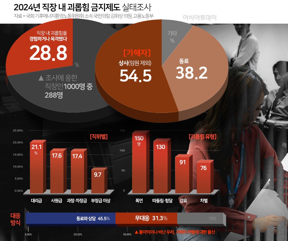 15일 국회 기후에너지환경노동위원회 소속 국민의힘 김위상 의원이 고용노동부로부터 제출받은 '2024년 직장 내 괴롭힘 금지제도 실태조사'에 따르면, 조사에 응한 직장인 1000명 중 288명인 28.8%가 최근 1년 사이 직장 내 괴롭힘을 경험하거나 목격했다고 답했다.