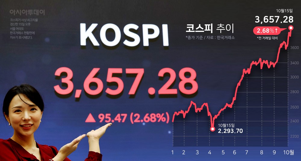 15일 한국거래소에 따르면 코스피 지수는 전 거래일 대비 2.68% 오른 3657.28에 장을 마쳤다. 장 중 최저가는 3577.06, 최고가는 3659.91을 기록했다.