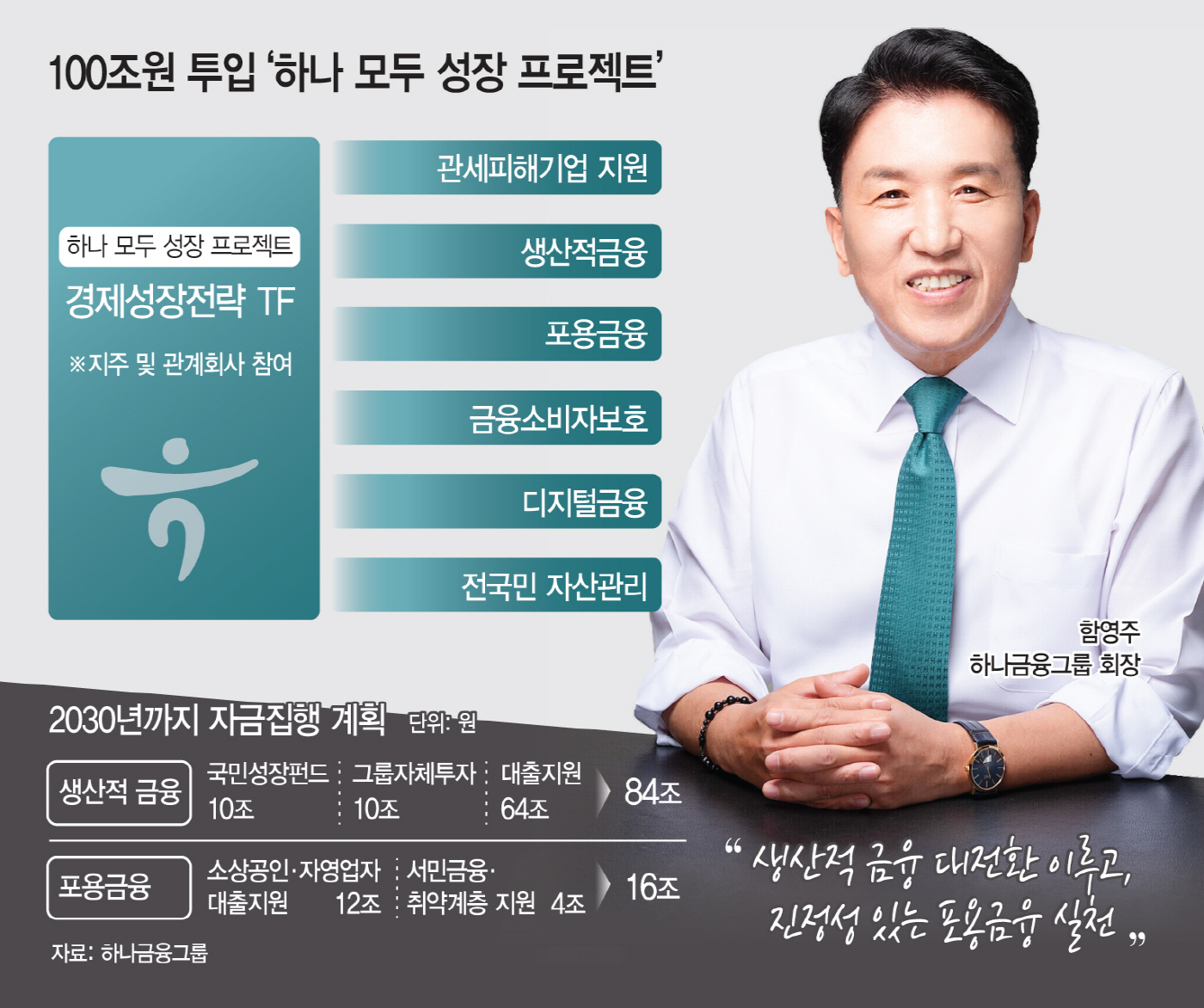함영주 하나금융그룹 회장이 우리 경제의 산업구조 재편과 혁신기업 발굴을 위한 생산적 금융으로의 전환과 민생 안정을 위한 포용금융 실천을 위해 그룹 역량을 집중한다. 이재명 정부의 경제성장 정책에 발맞춰 2030년까지 100조원의 자금을 투입한다. 국민성장펀드에 10조원을 출자하는 등 생산적 금융에 84조원을, 소상공인과 금융취약계층을 위한 포용금융에 16조원을 지원한다.