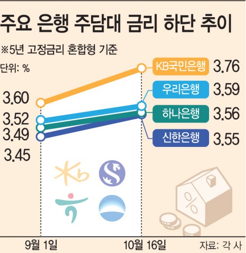 16일 금융권에 따르면 KB국민은행은 이날 기준 5년 고정형 주담대 금리를 3.76~5.16%로 책정했다. 이는 지난 9월 초와 비교해 0.16%포인트 오른 수준이다. 같은 기간 신한·하나·우리은행 등 다른 시중은행도 고정형 주담대 금리를 각각 0.07~0.10%포인트 인상했다. 시중은행들이 가계대출 수요를 억제하기 위해 높은 가산금리를 유지하는 가운데, 기준금리 역할을 하는 은행채 금리까지 상승한 것이 원인으로 꼽힌다.