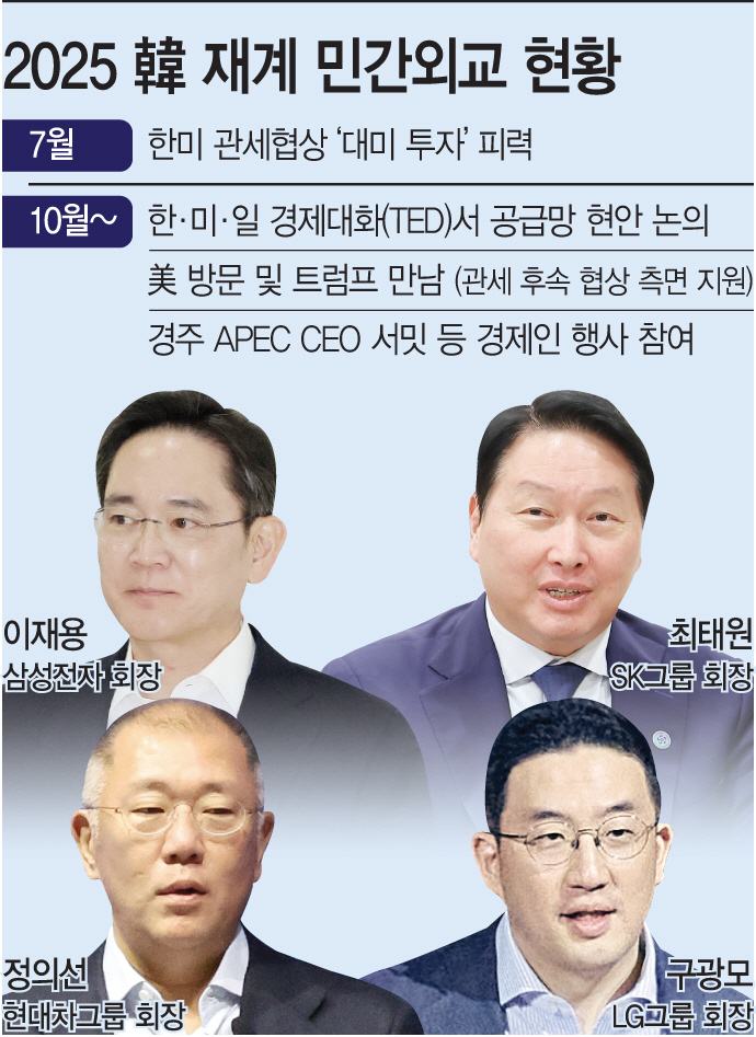 이 밖에도 전날인 15일 이재용 회장, 정의선 회장, 조현준 효성그룹 회장 등은 일본에서 열린 제3회 '한미일 경제대화'(TED)에 참석해 글로벌 공급망 위기에 긴밀히 공조하기로 뜻을 모았다. 이달 말 우리나라에서 진행되는 APEC 행사에서도 조현상 HS효성 부회장이 ABAC(기업인자문위원회)의 의장을 맡는 등 주도적 역할이 기대된다. 트럼프 대통령의 대미 투자 유치가 APEC 행사를 계기로 본격화될 수 있다는 관측도 나온다.