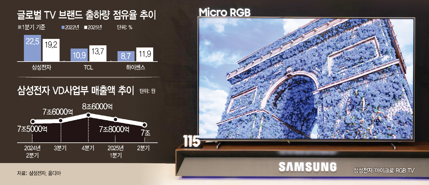 전세계적인 전방 수요 둔화와 시장 경쟁 심화로 인한 TV 사업의 부진 영향이 컸던 것으로 풀이된다. 삼성전자 반기보고서를 보면 올해 상반기 TV 평균 판매가격은 지난해 연간 평균보다 4% 떨어졌다. VD사업부는 올해 2분기에도 전년 동기보다 7% 하락한 7조원의 매출을 거두는 데 그쳤다.
