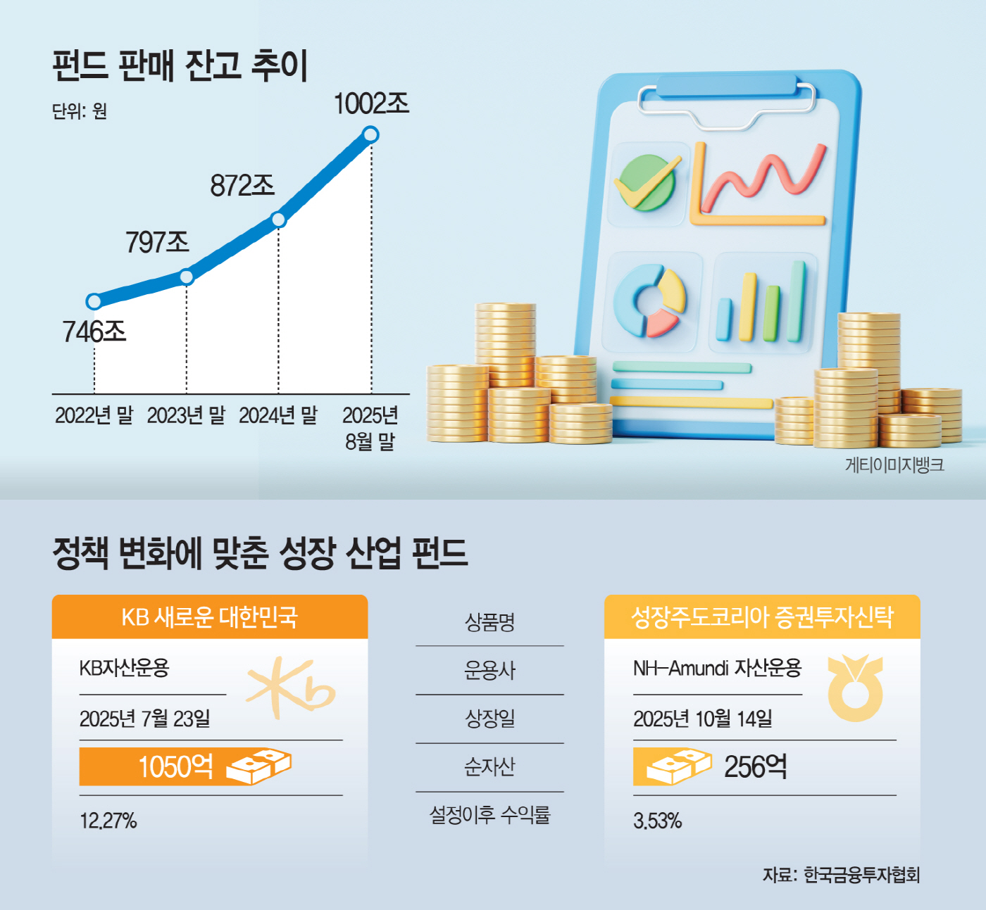 국내 펀드 판매잔고가 사상 처음으로 1000조원을 넘어섰다. 법인과 개인의 자금 유입이 꾸준히 이어지는 가운데 자산운용사들은 인공지능(AI)·방산·중장기채 등 다양한 테마형 펀드 상품을 잇달아 내놓고 있다. 연말까지 투자자들의 수요가 커질 것으로 예상될 뿐 아니라 정부 정책과 연계된 상품 출시로 장기 투자 자금도 증가할 것으로 보이기 때문이다.