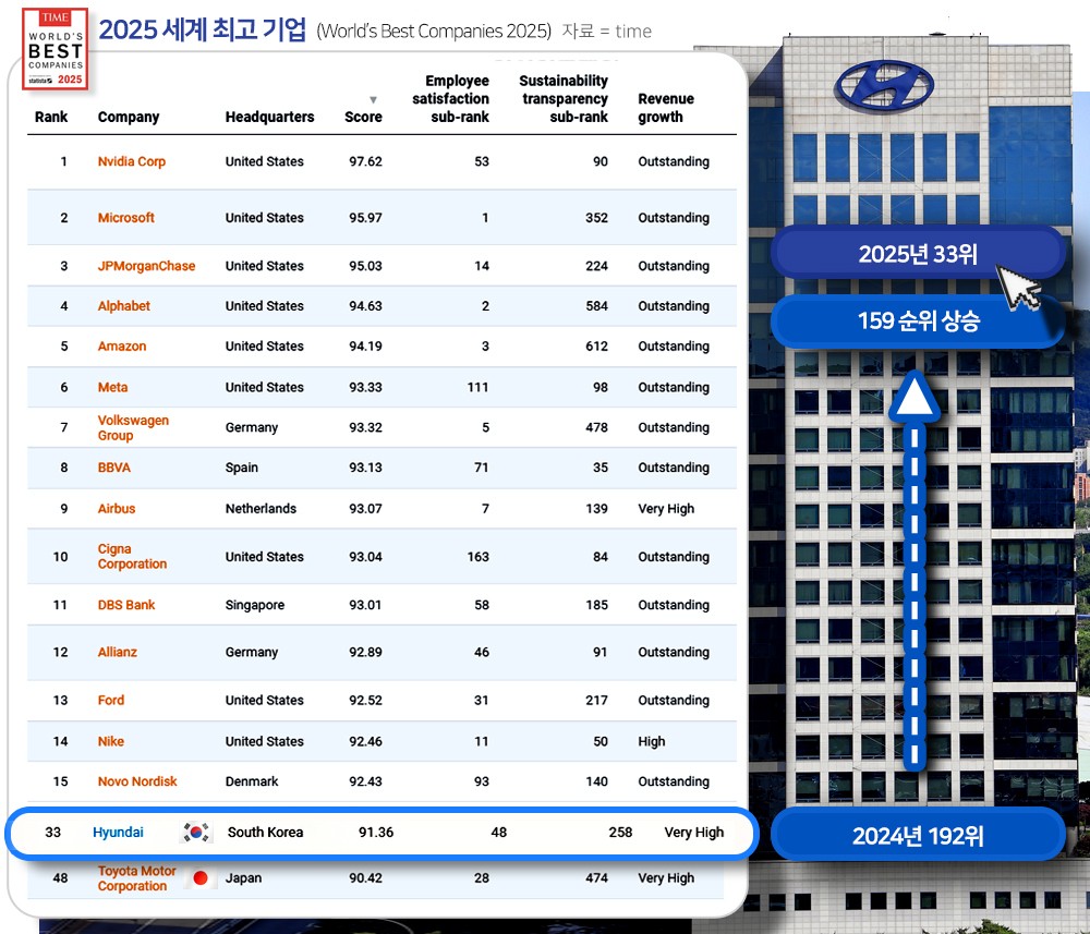 현대자동차가 미국 시사 주간지 '타임'이 발표한 '2025 세계 최고 기업'에서 국내 기업 중에서 가장 높은 순위를 기록하는 기염을 토했다. 상위 100대 기업에 포함된 국내 기업은 현대차가 유일했고, 일본의 토요타 보다도 순위가 15계단 더 높았다.