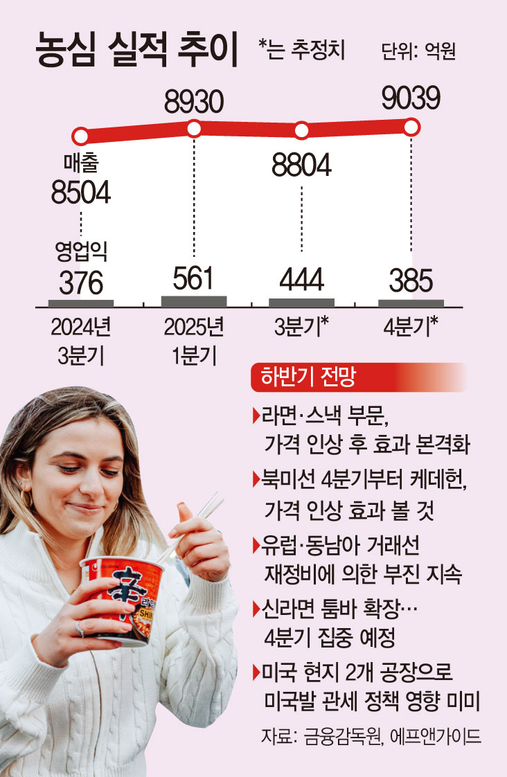 식품업계의 한 관계자는 "농심은 가격 인상 이후 수요 회복 속도는 안정적인 편"이라며 "북미 시장에서의 확실한 가격 인상 효과와 '케데헌' 같은 협업의 성과가 3분기 이후 실적에 긍정적인 모멘텀을 제공할 것"이라고 말했다.
