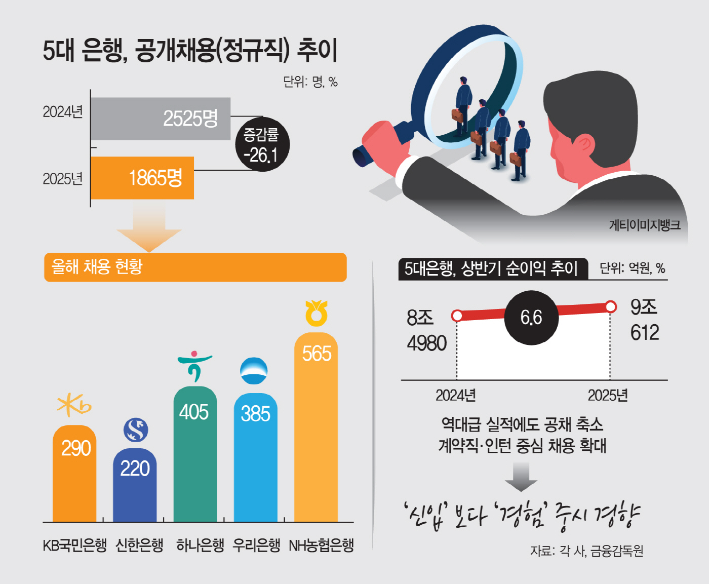 20일 금융권에 따르면 5대 은행(KB국민·신한·하나·우리·NH농협)의 올해 정규직 신입 채용 규모는 전년 대비 26.1% 감소한 1865명으로 집계됐다.