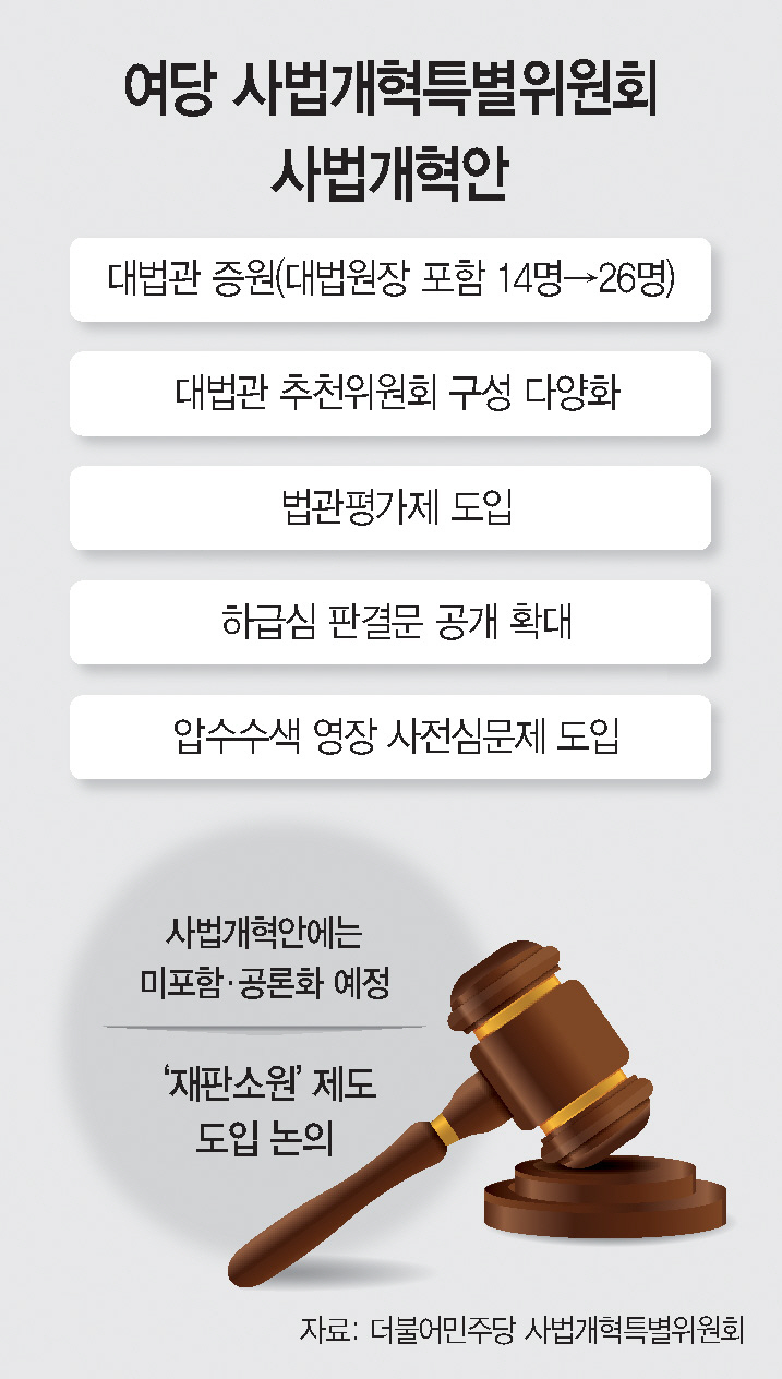 이날 민주당의 사법개혁안 발표는 예고된 수순이자 이재명 정부 '3대 개혁'의 가장 중요한 작업이었다. 추석 전 검찰개혁을 완수한 여당이 사법부로 칼끝을 돌린 것이다. 민주당은 "끼워 맞추기식 졸속 재판으로 대선에 개입했다"며 사법부를 향한 불신을 개혁의 명분으로 내걸었다. 정청래 대표는 "사법부가 바로 서야 삼권분립이 바로 서고 나라가 바로 선다"며 이번 개혁이 사법 정의를 바로 세우는 일임을 분명히 했다.