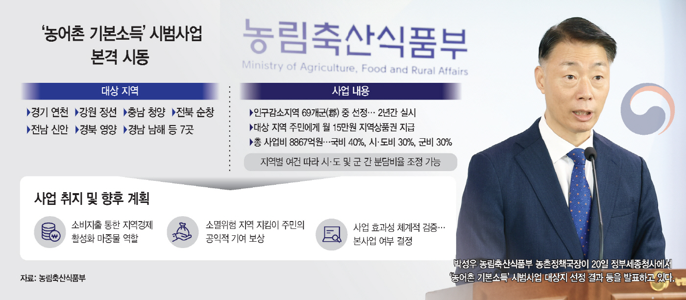 박성우 농식품부 농촌정책국장은 이날 오전 정부세종청사에서 브리핑을 열고 "지역 소멸위험도 및 발전 정도, 지방자치단체 추진 계획의 실현 가능성, 기본소득과 연계한 성과 창출 계획 등을 종합적으로 고려했다"고 선정 배경을 밝혔다.