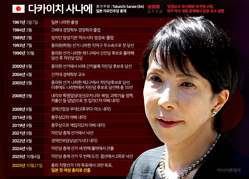 64세인 다카이치는 아베 신조 전 총리의 경제 정책과 보수 성향을 계승해 '여자 아베'라는 별칭으로 불리며 원내 주도권을 확실히 했다. 그의 집권은 자민당과 오랜 동맹 관계였던 공명당의 연립 이탈과 함께, 새로운 정치 구도 속 보수 연립 내각 출범을 의미한다.