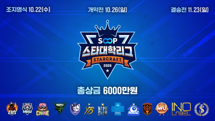 SOOP은 오는 22일부터 다양한 스트리머가 함께 참여하는 ‘SOOP 스타대학리그’를 진행한다고 밝혔다. 이번 대회는 10월 22일 프릭업 스튜디오에서 열리는 조지명식을 시작으로 11월 23일 상암 SOOP 콜로세움 오프라인 결승전까지 약 한 달간 이어진다.
