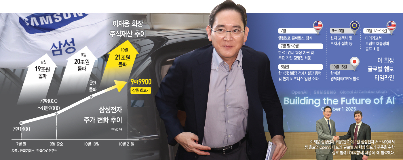 이 회장은 석 달 동안 그야말로 광폭 행보를 보였다. 지난 7월 초 미국 아이다호에서 열린 '앨런앤드컴퍼니 선밸리 콘퍼런스'에 참석해 글로벌 미디어·테크 기업 수장들과 교류한 것을 시작으로, 실리콘밸리와 워싱턴 D.C.를 잇달아 방문해 주요 빅테크 경영진과 연쇄 회동을 가졌다. 같은 시기 한미 정상회담 경제사절단 일정에도 동행해 미국 정치·경제 네트워크를 넓혔고 이후 유럽으로 무대를 옮겨 반도체·IT 고객사 및 투자자들과 접촉했다. 10월 중순에는 일본에서 열린 한미일 경제대화(TED)에 참석했으며 미국 플로리다 마러라고에서 국내 대표 기업인들과 함께 도널드 트럼프 미국 대통령을 만나 '골프 회동'을 갖기도 했다. 이달 말에는 APEC CEO 서밋에서 주요국 정상들, 글로벌 기업 대표들과 마주 앉는다.