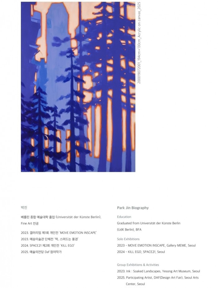박진은 2023년 갤러리밈에서 첫 개인전 〈MOVE EMOTION INSCAPE〉을 열며 내면의 감정과 풍경의 관계를 탐구했고, 같은 해 예송미술관 단체전〈먹, 스며드는 풍경〉에 참여해 동양적 사유와 서양 회화의 조화를 시도했다.
