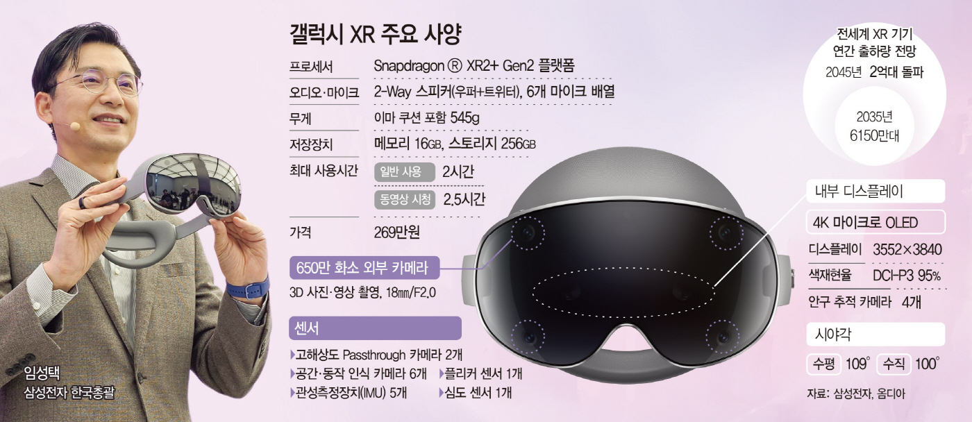 무게 545g의 갤럭시 XR은 균형 잡힌 인체공학 설계로 장시간 착용에도 피로감이 적다. 탈착형 '외부광 차단 패드'로 몰입감을 높였고, 다비치안경에서 맞춤 제작 가능한 도수형 인서트 렌즈도 지원한다. 삼성은 XR을 소비자용뿐 아니라 기업용(B2B) 솔루션으로도 확장하고 있다. 삼성중공업과는 가상 조선소 훈련 시스템을 구축 중이며 의료 현장에서는 XR을 이용한 시뮬레이션 교육이 확산되고 있다.