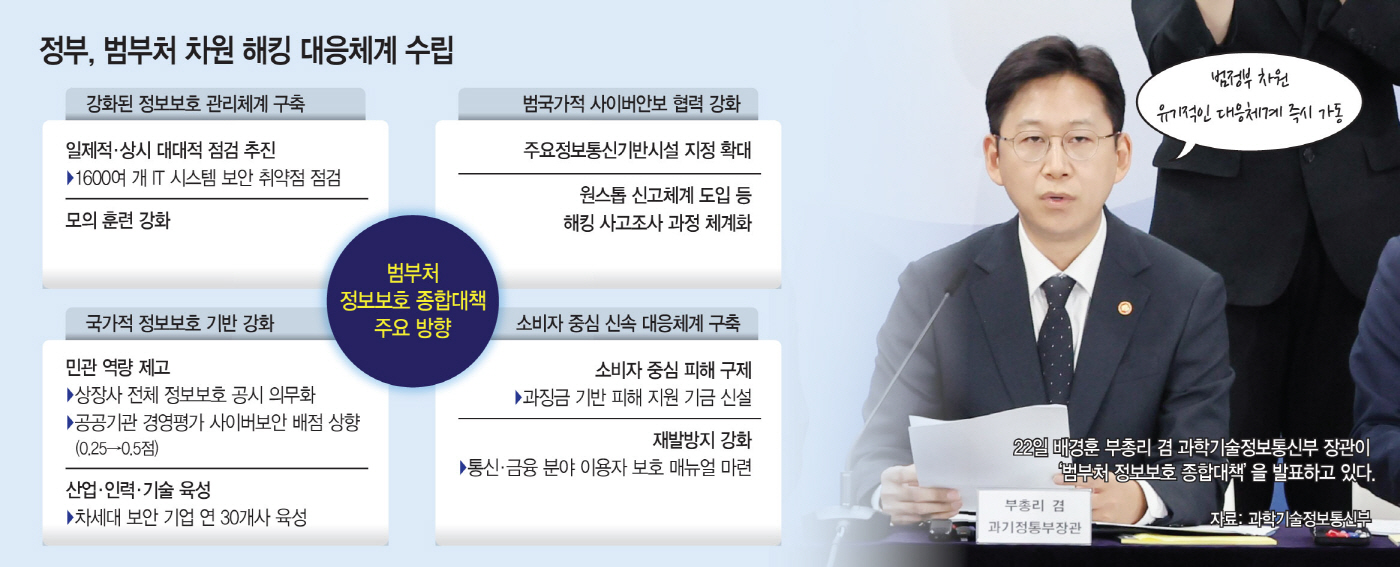 배경훈 부총리 겸 과학기술정보통신부 장관은 22일 정부서울청사에서 '범부처 정보보호 종합대책'을 발표했다. 배 부총리는 "정부는 분야를 막론하고 반복되는 최근 일련의 해킹 사고를 심각한 위기 상황으로 인식, 범정부 차원의 유기적인 대응체계를 즉시 가동하고자 한다"고 말했다.