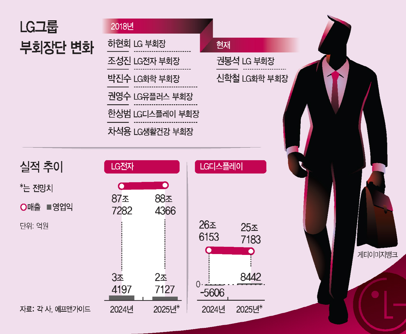 2023년 말 LG디스플레이 구원투수로 등판한 정철동 사장의 승진 여부도 관심사다. 장기간 적자에 시달렸던 LG디스플레이는 정 사장 체제에서 고강도 체질개선에 나서면서 올해 4년 만에 흑자전환이 점쳐진다. 홍기용 인천대 경영학과 교수는 "LG와 같이 다양한 사업을 영위하는 기업에서 부회장단은 각 계열사를 그룹핑해 보다 세밀하게 미래 전략을 짜는 중요한 역할을 한다"며 "계열사 간 시너지 효과를 비롯해 유연한 네트워크를 구축할 수 있다는 점에서도 긍정적"이라고 밝혔다.