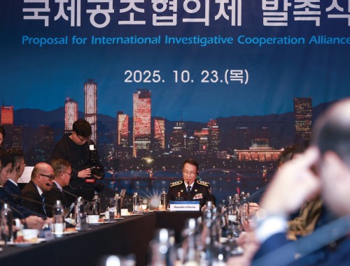 23일 서울 여의도에서 열린 국제공조협의체 발족식 모습. 유재성 경찰청장 직무대행이 관련해 발언하고 있다. /제공=경찰청 |