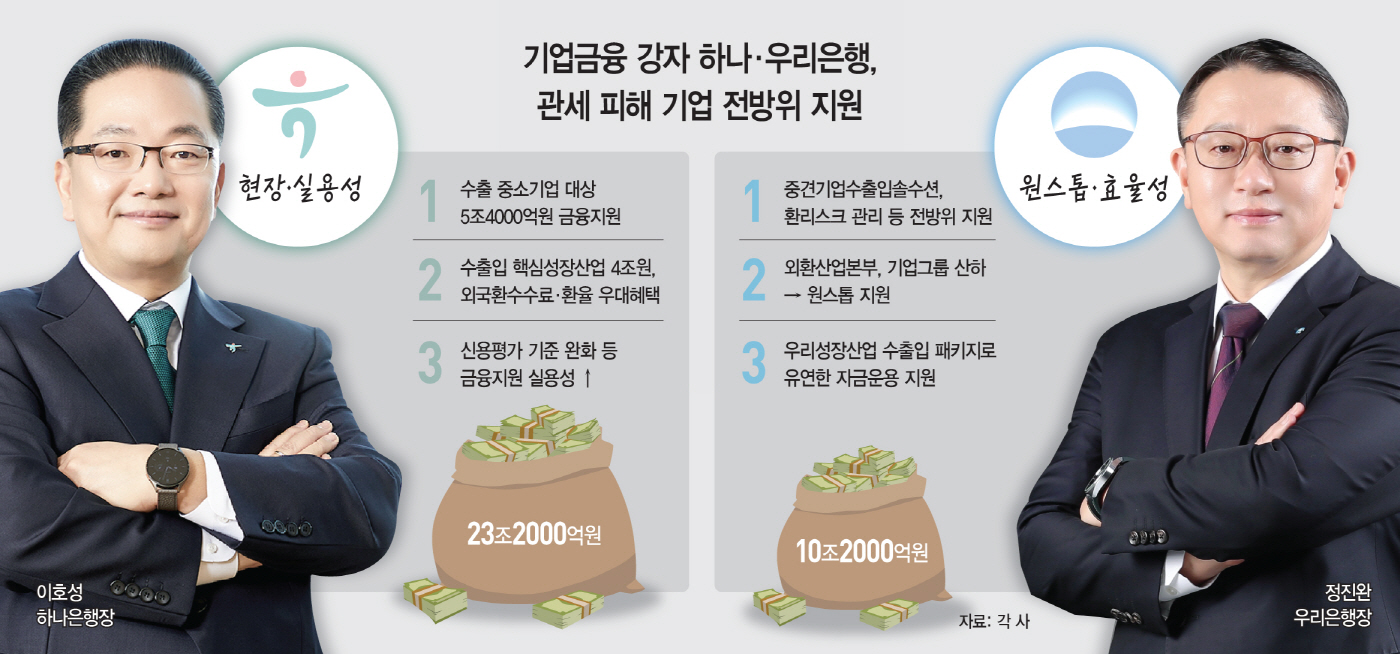 기업금융의 강자로 꼽히는 하나은행과 우리은행이 미국 트럼프 행정부의 관세 정책으로 피해를 입은 기업들에 대한 금융 지원에 적극 나서고 있다.