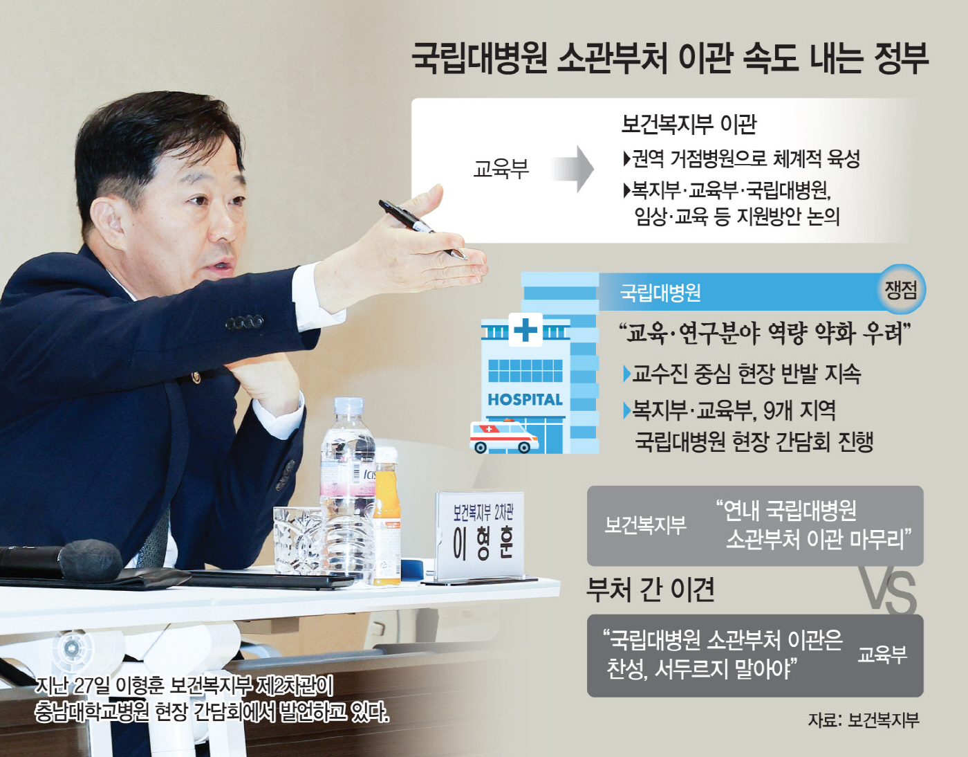 28일 의료계에 따르면 보건복지부가 국립대병원 소관부처 이관 작업을 연내로 마치겠다는 방침을 전하고 있는 가운데, △교육·연구분야 역량 약화 △이관 속도 조절 등과 관련해 의료 현장과 관계 부처에서 이견이 나오고 있다.