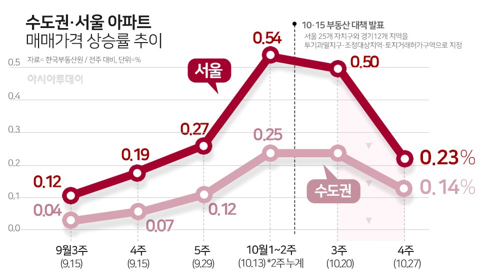 30일 한국부동산원이 발표한 10월 넷째 주(27일 기준) 서울 아파트 가격은 0.24% 올랐다. 지난주 0.50%의 상승률을 보이며, 역대 최대 오름폭을 보였으나 절반 이상으로 줄어든 것이다.