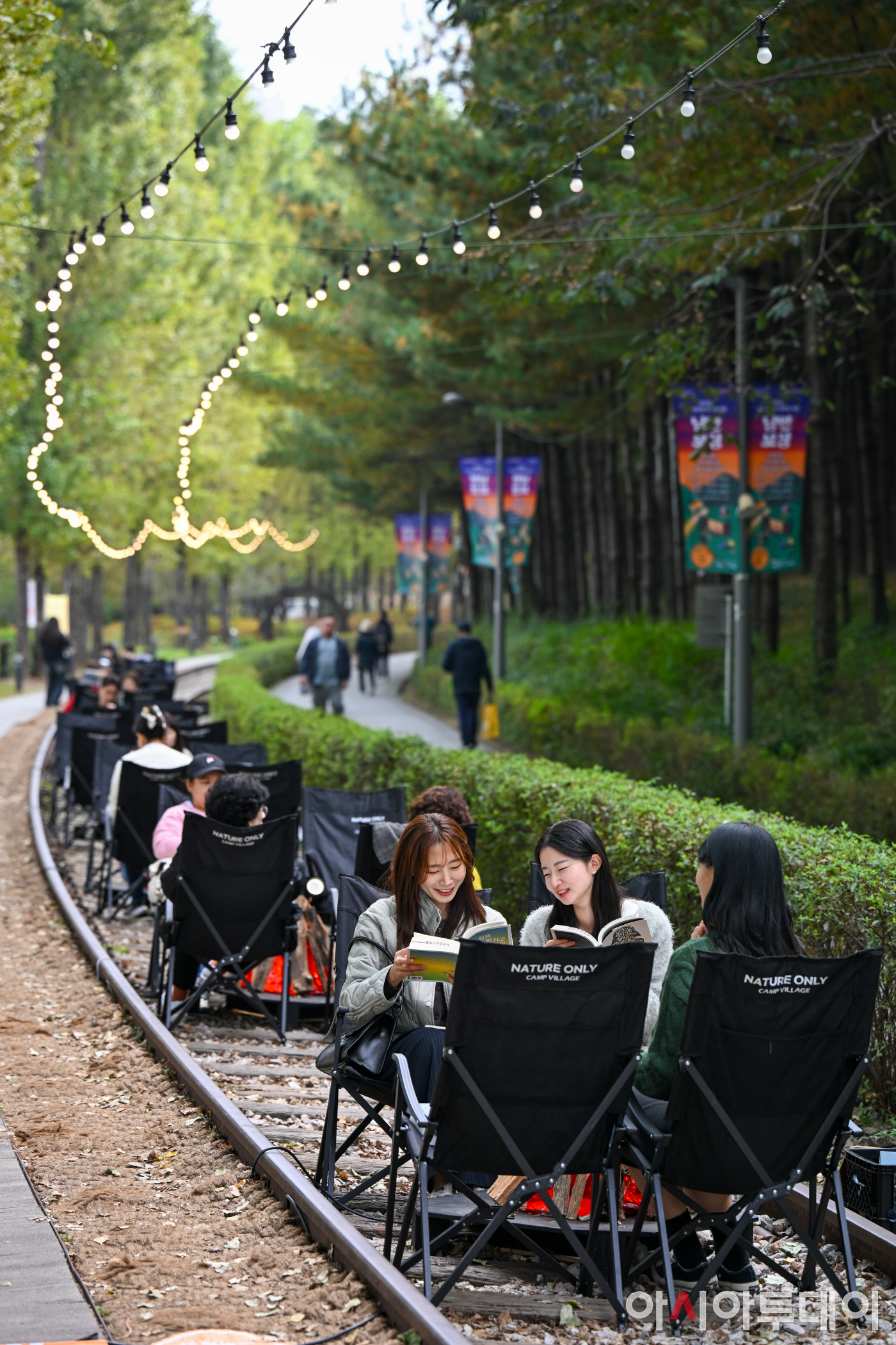 31일 서울 노원구 경춘선 숲길 일대에서 열린 '노원 몽:땅 야외도서관 : 낭만보장(場)'을 찾은 시민들이 독서를 즐기고 있다. 노원구는 경춘선 숲길 일대에서 시민들이 일상에 특별한 가을 낭만을 즐길 수 있도록 이번 행사를 마련했다. 철길을 따라 가을 정취를 느끼며 불빛을 바라보는 불멍존, 숲길에서 돗자리를 펼치고 앉아 책을 읽는 북크닉존, 작가와의 만남과 공연, 플리마켓과 푸드트럭이 함께하는 북쉼터와 취식 공간 등 다양한 즐길 거리와 체험 프로그램을 오는 2일까지 진행한다. /정재훈 기자