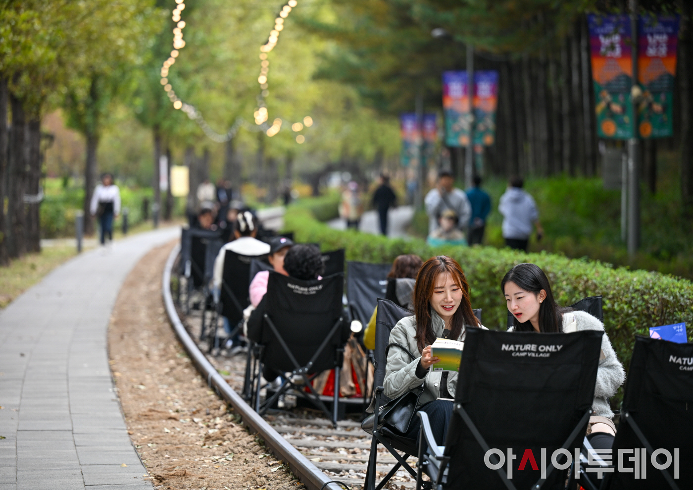31일 서울 노원구 경춘선 숲길 일대에서 열린 '노원 몽:땅 야외도서관 : 낭만보장(場)'을 찾은 시민들이 독서를 즐기고 있다. 노원구는 경춘선 숲길 일대에서 시민들이 일상에 특별한 가을 낭만을 즐길 수 있도록 이번 행사를 마련했다. 철길을 따라 가을 정취를 느끼며 불빛을 바라보는 불멍존, 숲길에서 돗자리를 펼치고 앉아 책을 읽는 북크닉존, 작가와의 만남과 공연, 플리마켓과 푸드트럭이 함께하는 북쉼터와 취식 공간 등 다양한 즐길 거리와 체험 프로그램을 오는 2일까지 진행한다. /정재훈 기자