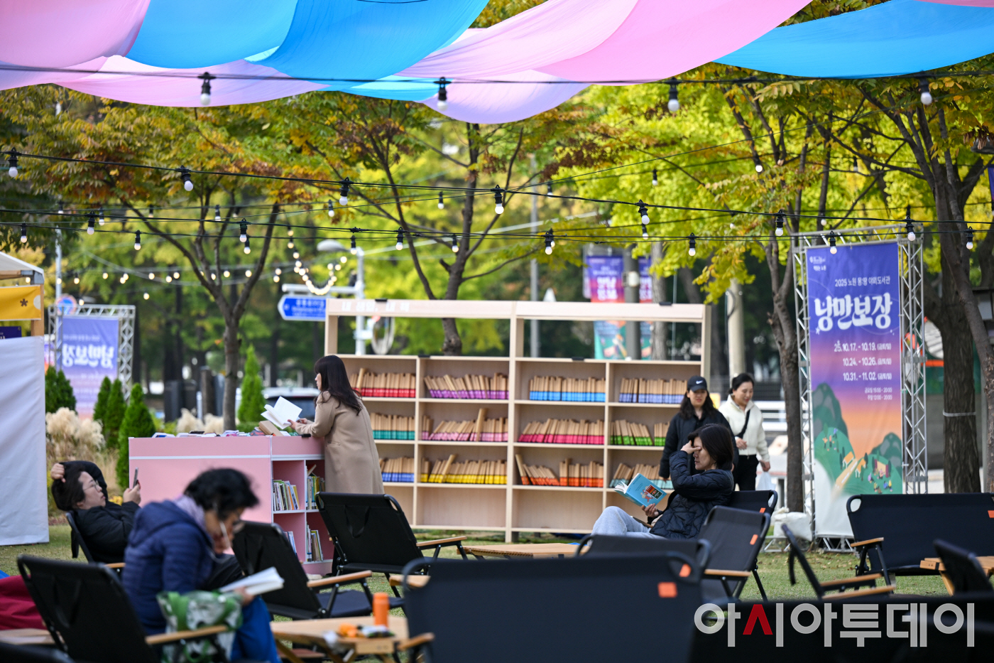 31일 서울 노원구 경춘선 숲길 일대에서 열린 '노원 몽:땅 야외도서관 : 낭만보장(場)'을 찾은 시민들이 독서를 즐기고 있다. 노원구는 경춘선 숲길 일대에서 시민들이 일상에 특별한 가을 낭만을 즐길 수 있도록 이번 행사를 마련했다. 철길을 따라 가을 정취를 느끼며 불빛을 바라보는 불멍존, 숲길에서 돗자리를 펼치고 앉아 책을 읽는 북크닉존, 작가와의 만남과 공연, 플리마켓과 푸드트럭이 함께하는 북쉼터와 취식 공간 등 다양한 즐길 거리와 체험 프로그램을 오는 2일까지 진행한다. /정재훈 기자