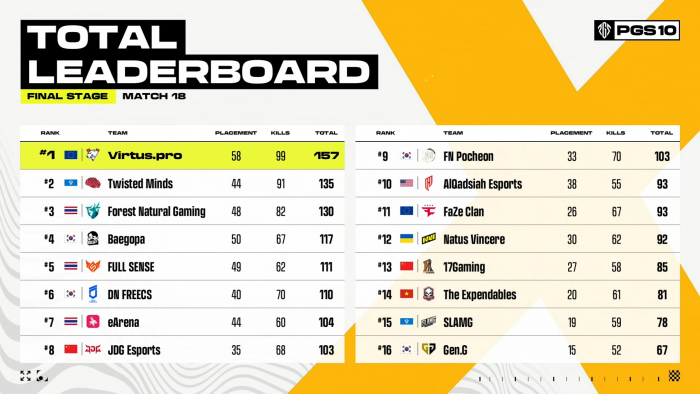11월 2일 크래프톤이 주최한 'PGS 10' 파이널 스테이지 3일 차 경기가 말레이시아 세렘반 카리스마 아레나에서 진행됐다. 버투스 프로는 이날 47점을 추가하면서 최종 합계 157점으로 시즌 10 우승 트로피를 들어 올렸다.