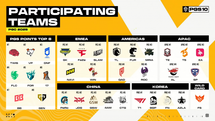 이에 따라 한국은 총 6개 팀이 'PGC 2025' 출전권을 확보했다. DN 프릭스와 젠지가 PGS 포인트로 진출했고 국내 리그 성적 기준으로 T1, 배고파, FN 포천, 아즈라 펜타그램이 추가 슬롯을 확보했다. 이는 단일 국가 기준 PGC 역사상 최다 진출 기록이다.
