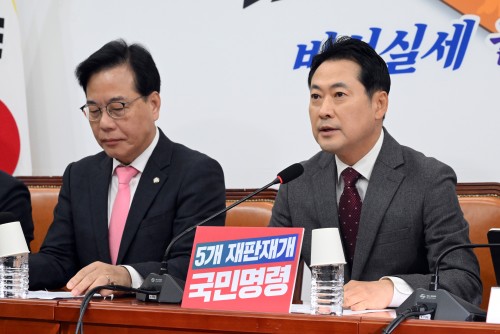 송언석 원내대표는 "더불어민주당은 대장동 일당의 1심 판결로 이 대통령의 무죄가 확인됐다고 주장한다"며 "무죄가 확실하면 조속히 재판을 재개해서 무죄를 확정 지어달라고 요구해야 하는 것이 순서 아니겠냐"고 지적했다.
