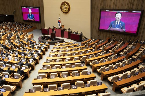 하지만 '협조'의 주요 주체인 100석 가까운 제1야당 석은 텅 비어 있었다. 국민의힘 의원들은 본회의장에 입장하는 대신에 국회 로텐더홀 계단에서 피켓 등을 들고 시위를 벌였다. 국힘 의원들 손에는 '명비어천가''야당파괴' '야당탄압' '불법 특검' 등 문구가 적힌 피켓이 들려 있었다.