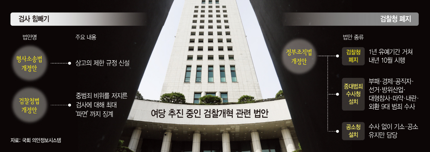 여당은 검찰 해체를 골자로 한 '검찰청법 폐지안', '공소청 설치법', '중수청 설치법', '국가수사위원회(국수위) 설치법' 등 4개 법안을 발의했다. 검찰청을 법 체계에서 삭제하고 수사와 기소 기능을 분리하는 내용이다. 이후 9월 26일 여당은 국무총리 직속으로 신설 예정이던 국수위를 제외하고, 검찰청 폐지와 공소청·중수청 설치를 골자로 한 정부조직법 개정안을 국회에서 통과시켰다. 같은 달 30일 국무회의 의결로 확정되면서 검찰청은 1년의 유예기간을 거쳐 기소만 담당하는 공소청과, 수사만 하는 중수청으로 나뉘게 됐다.