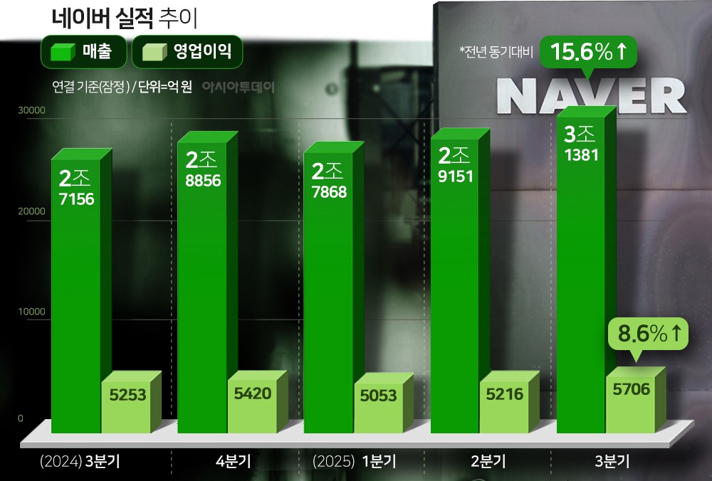 5일 네이버는 3분기 연결 기준 3조1381억원, 영업이익 5706억원, 순이익 7347억원을 기록했다고 밝혔다. 매출은 전년 동기 대비 15.6%, 영업이익은 8.6% 증가한 수치로, 분기 기준 처음으로 매출 3조원을 돌파하며 역대 최대 실적을 새로 썼다.