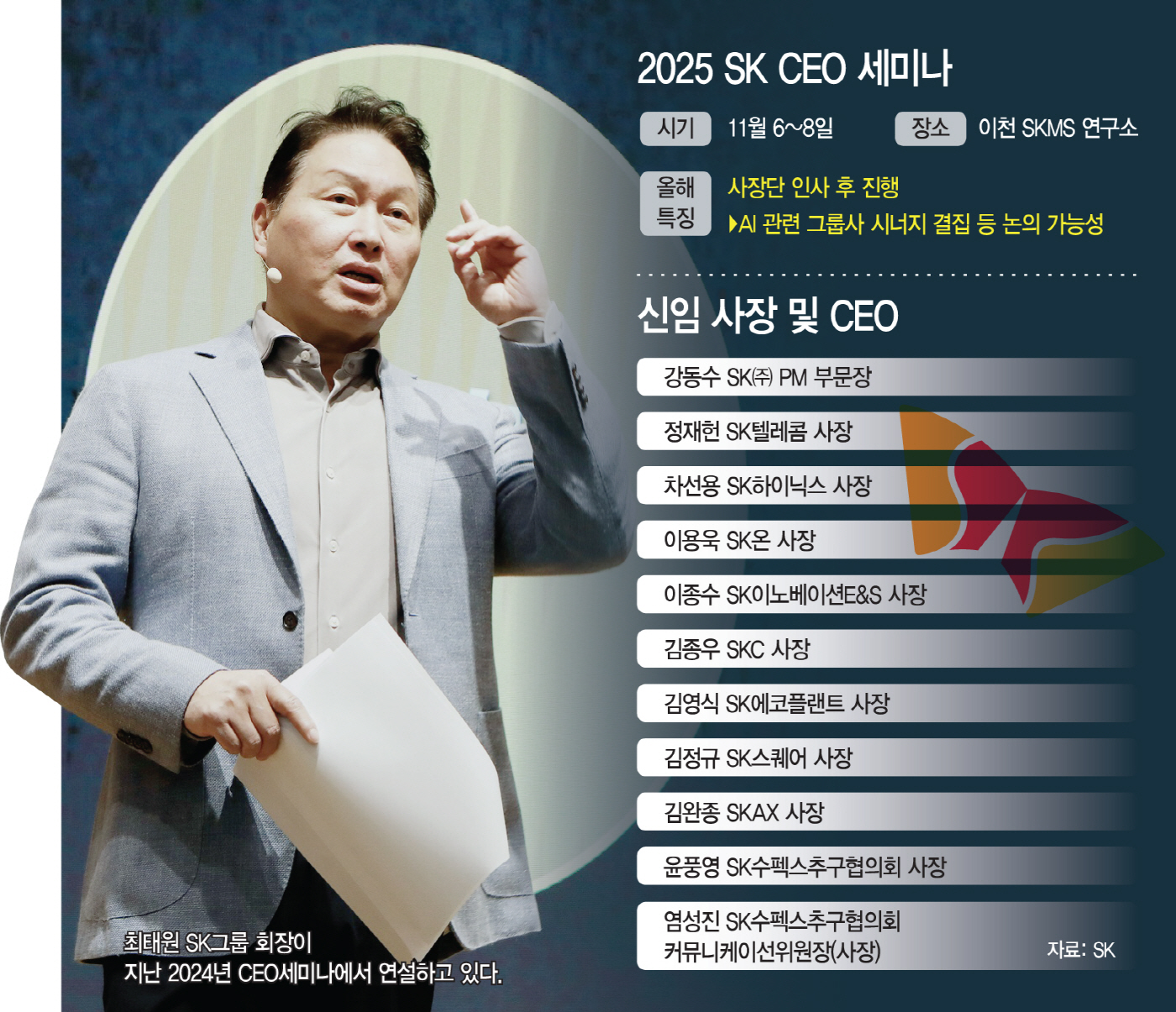 특히 지난 사장단 인사에서 새로운 얼굴이 대거 등용된 만큼 그룹 전체의 방향을 정립하고 계열사간 시너지를 도모하기 위한 자리가 될 것이란 전망이다. 앞서 최태원 SK그룹 회장은 APEC CEO 서밋부터 SK AI서밋까지 거치면서 사업의 방향성을 'AI'로 명확히 제시한 바 있다.