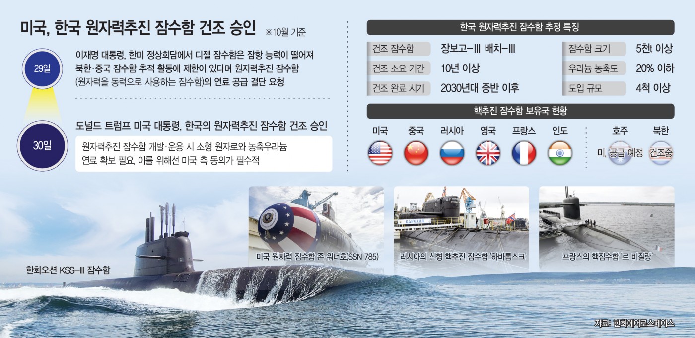 지난 5일 국무회의에서 국방부는 "원자로 및 무장 체계 등 핵심 기술을 이미 확보했다"며 "안전성 검증 단계에 들어섰다"고 보고했다. 같은 날 피트 헤그세스 미국방장관은 제57차 한미안보협의회(SCM) 공동 기자회견에서 "트럼프 대통령이 한국의 원자력추진 잠수함 도입을 승인했음을 재확인한다"며 "미 국무부·에너지부와 협력해 전폭적으로 지원할 것"이라고 선언했다.