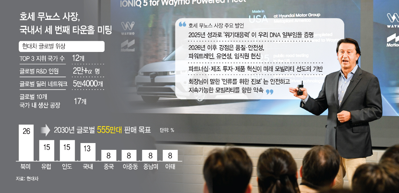 끝으로 무뇨스 사장은 임직원들에게 "회장님께서 말씀하신 '인류를 위한 진보' 비전은 모빌리티를 보다 안전하고, 지속 가능하며, 모두에게 접근 가능한 것으로 만들겠다는 약속"이라며 "이 비전은 우리가 고객을 대하는 태도, 서로에 대한 존중, 일상 속 실천에서부터 시작된다"고 당부했다.