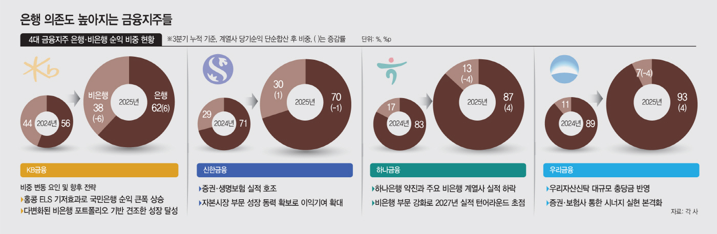 6일 금융권에 따르면 올해 3분기 기준 4대 금융그룹(KB·신한·하나·우리)의 전 계열사 누적 순익 중 은행 순익이 차지하는 비중은 KB금융 62%, 신한금융 70%, 하나금융 87%, 우리금융 93%로 집계됐다. 작년과 비교하면 신한금융만 은행 비중이 약 1%포인트 줄었고, KB·하나·우리금융은 4~6%포인트 상승했다.