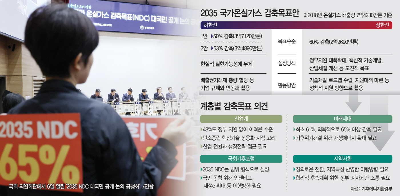 '2035년 국가 온실가스 감축목표(NDC)'의 하한선이 2018년 대비 50% 혹은 53%로 좁혀졌다. 정부는 산업계와 시민사회 등의 요구를 담은 절충안 마련이 어렵게 되자 두 가지 안을 놓고 공청회를 개최했지만, 여전히 '과도하다'와 '부족하다'는 의견이 팽팽히 대립했다.