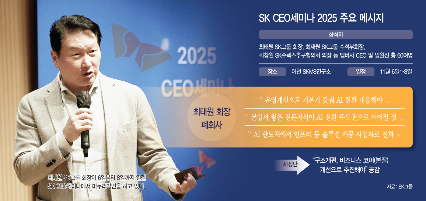 이를 위해 최 회장은 운영 개선의 방향을 '기본기 확립'이라고 봤다. 기본을 확실히 다지면서 AI 전환을 쌓아야 한다는 주문이다. 특히 효율화 작업이 재무 개선뿐만 아니라 각사 사업의 본원적인 경쟁력을 높이는 계기가 될 것이란 의미다.