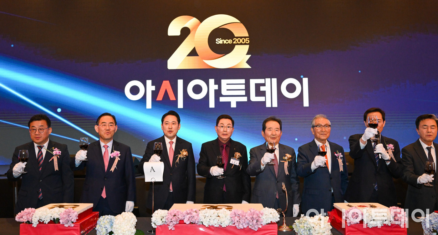 글로벌 종합일간지 아시아투데이가 창간 20주년을 맞이한 10일 서울 중구 소공동 롯데호텔 그랜드볼룸에서 열린 창간 20주년 기념행사에서 우종순 아시아투데이 회장(가운데)과 장동혁 국민의힘 대표, 정세균 전 국회의장 등 참석 내빈들이 축하 건배를 하고 있다. (사진 오른쪽부터) 김태흠 충남지사, 우상호 대통령실 정무수석, 손병두 CNBCKOREA 회장, 정세균 전 국회의장, 우종순 회장, 장동혁 국민의힘 대표, 주호영 국회부의장, 박종현 한국기자협회장. /정재훈 기자