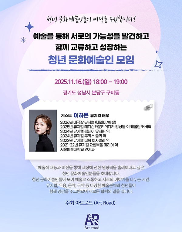 이대은 아트로드 대표는 "재능은 있으나 무대가 부족했던 청년 예술인들이 서로의 가능성을 발견하고 새로운 길을 함께 만들기를 바란다"며 "예술의 본질인 연결과 공감을 바탕으로, 이번 모임이 장르와 세대를 아우르는 청년 문화예술인 커뮤니티의 정례화 시발점이 될 것으로 기대한다"고 밝혔다.