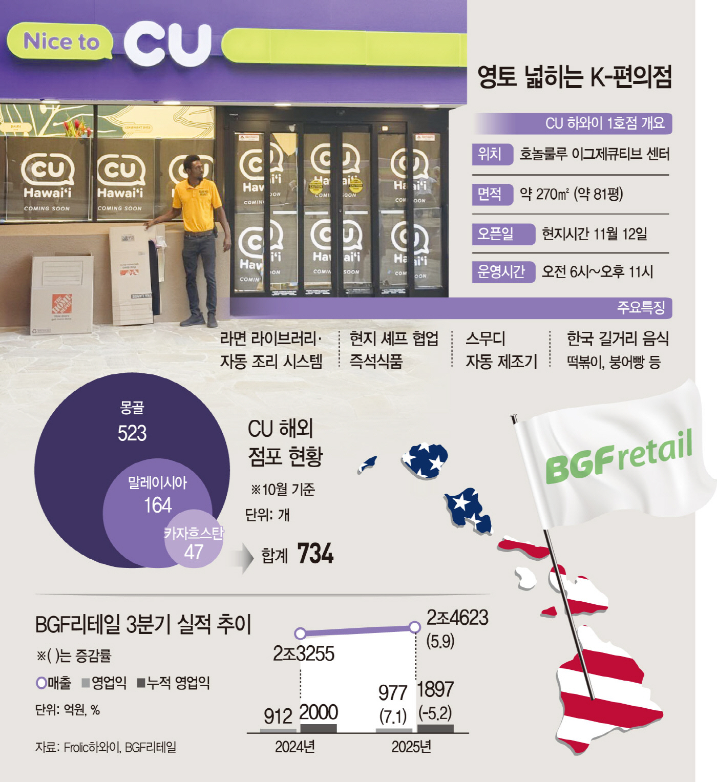 10일 업계에 따르면 BGF리테일은 하와이 호놀룰루 도심 이그제큐티브 센터에 약 270㎡(약 81평) 규모의 CU 하와이 1호점을 개점한다. 앞서 지난 7일에는 패밀리데이(프리뷰) 행사를 통해 매장을 공개했다. BGF리테일은 지난 5월 현지 법인인 BGF리테일 하와이를 설립하고, 현지 파트너사 WKF의 신설 법인인 CU 하와이 LLC와 마스터프랜차이즈(MF) 계약을 체결한 지 약 반년 만이다.